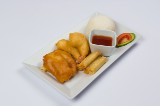 Express Kombo med sötsur sås (vårrullar vegetarisk, friterad kyckling och friterade räkor)